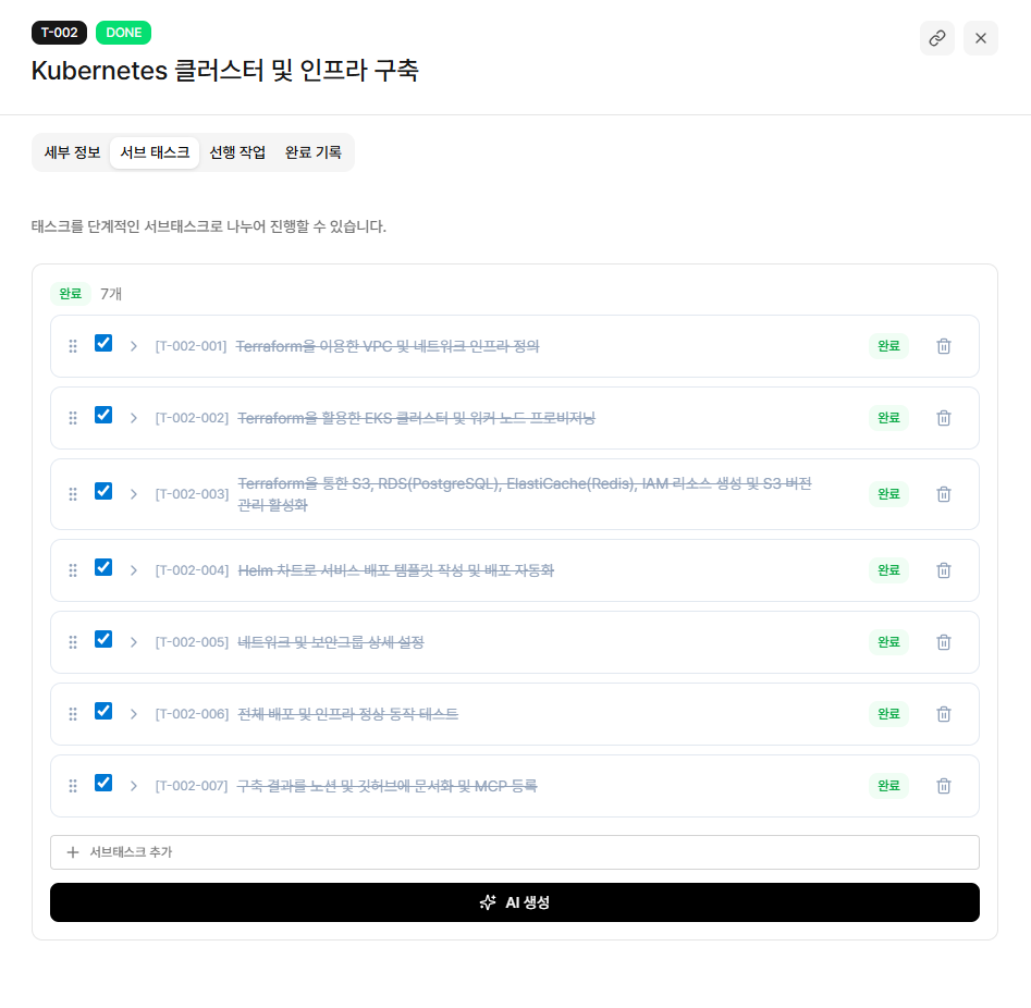 이번 글에서는 RAG 기반 문서 검색 시스템의 핵심 인프라를 어떻게 Terraform과 Helm으로 자동화하고, 보안 및 운영 관점에서 완성도 높은 클라우드 환경을 구성했는지를 다뤘다. 모든 구성은 문서화되어 팀원 또는 외부 이해관계자와 공유 가능하며, 실제 운영 환경에서도 바로 사용할 수 있는 수준으로 마무리되었다. 다만 구성에 있어 완벽한 이해도가 충족되지 않은 상태로 AI 의 도움을 많이받아 구성한만큼 다른 태스크보다 더 심도깊게 복습할 필요성을 느꼈다. 다음 글에서는 본격적인 프론트엔드 개발 흐름인 T-003 태스크를 다룬다. Next.js 기반 프로젝트 초기화부터 인증 흐름, 글로벌 상태관리, 접근성 적용까지 통합된 작업 흐름을 소개할 예정이다.